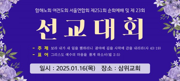 함해노회 여전도회서울연합회 제 251회 연합순회예배 및 제23회 선교대회가 1월 16일(목) 본 교회(삼위교회)에서 열렸습니다. 함해노회 서울연합회 지교회에서 많은 분들이 참석해서 말씀과 기도를 통해 복음의 능력으로 다시 살아가기로 결단하며, 새 역사를 창조하는 선교여성으…