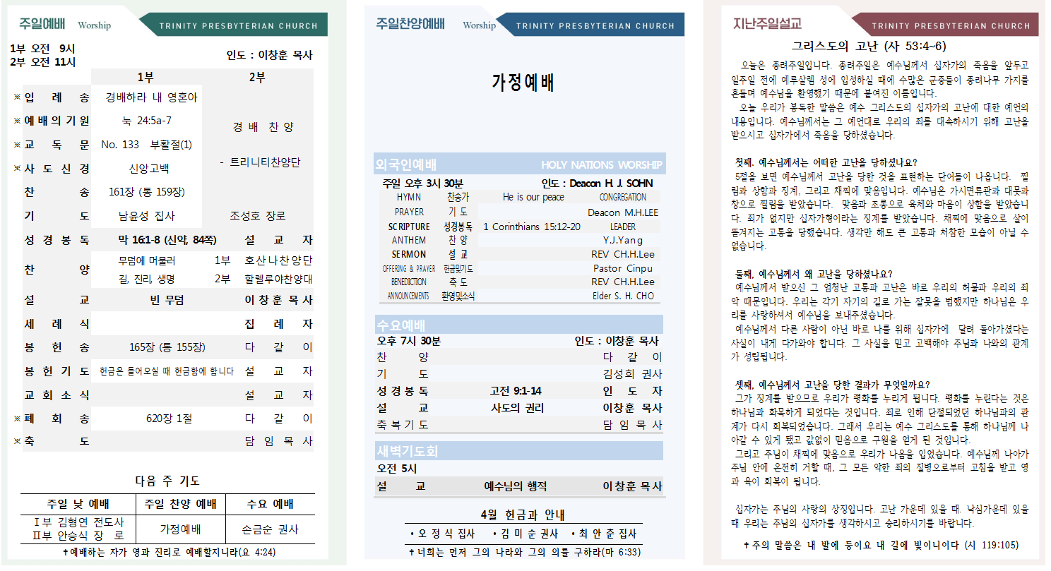 2021년 4월 4일 교회소식 삼위교회 댓글 0건 조회 17,441회 작성일 2021-04-03 13:34 가 본문내용 확대/축소 본문 2021년 4월 4일 교회소식2021년 4월 4일 교회소식 <이미지를 클릭하면 크게 보실 수 있습니다> 목록 댓글목록 이전글2021년 4월 11일 교회소식 21.04.10 다음글2021년 3월 28일 교회소식21.03.27