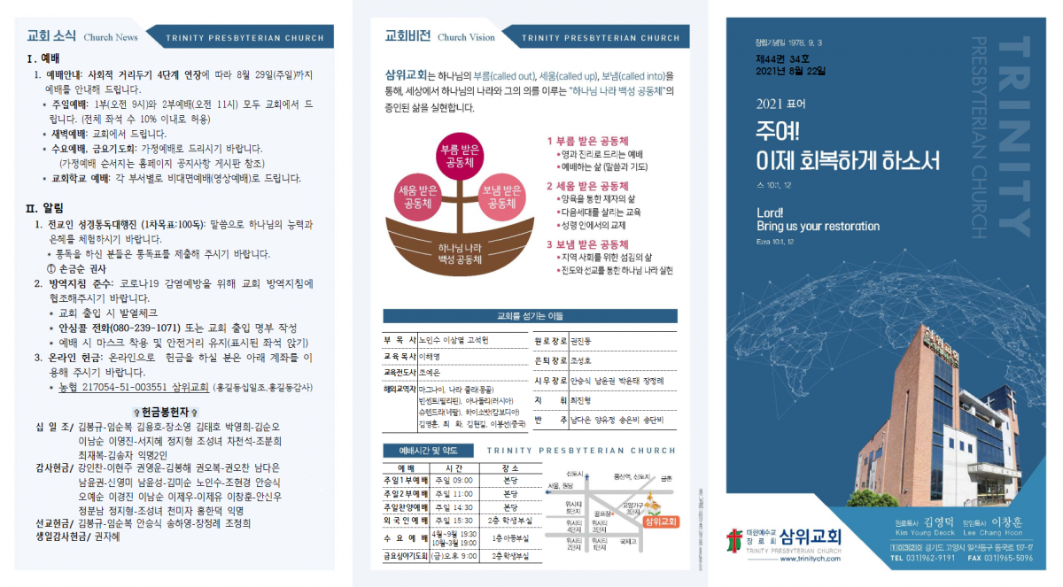 2021년 8월 22일 주보 삼위교회 댓글 0건 조회 17,134회 작성일 2021-08-21 17:21 가 본문내용 확대/축소 본문 2021년 8월 22일 주보2021년 8월 22일 주보 <이미지를 클릭하시면 크게 보실 수 있습니다.> 목록 댓글목록 이전글2021년 8월 29일 주보 21.08.28 다음글2021년 8월 15일 주보21.08.14