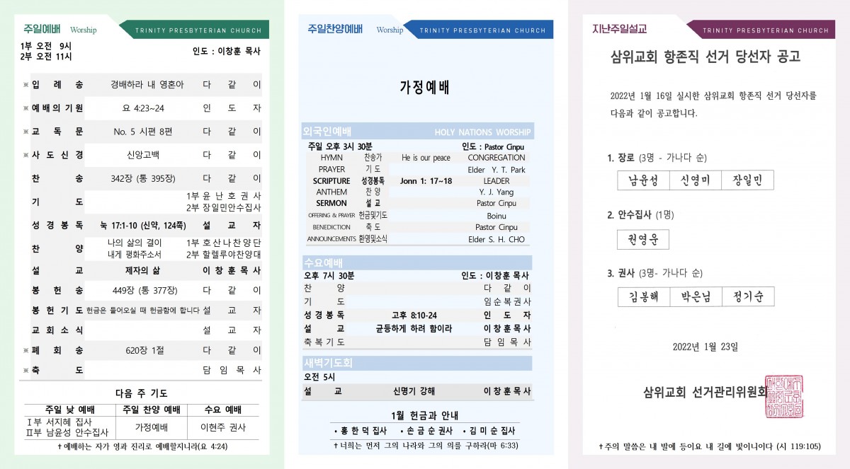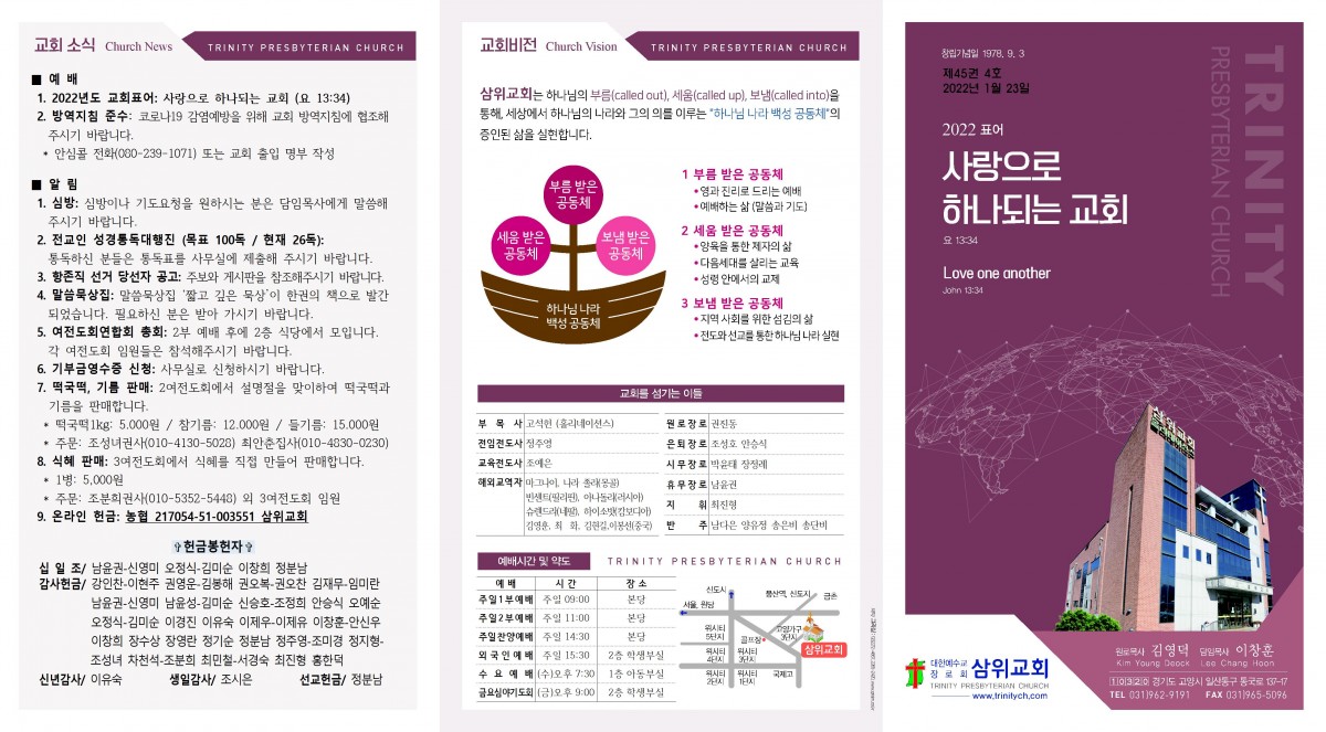 2022년 1월 23일 교회주보 삼위교회 댓글 0건 조회 16,466회 작성일 2022-01-22 13:34 가 본문내용 확대/축소 본문 2022년 1월 23일 교회주보2022년 1월 23일 교회주보 <이미지를 클릭하시면 크게 보실 수 있습니다.> 목록 댓글목록 이전글2022년 1월 30일 교회주보 22.01.29 다음글2022년 1월 16일 교회주보22.01.15