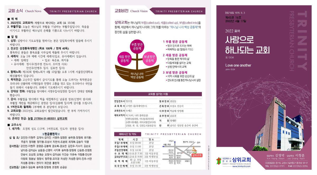 2022년 4월 17일 교회주보 삼위교회 댓글 0건 조회 16,227회 작성일 2022-04-16 14:56 가 본문내용 확대/축소 본문 2022년 4월 17일 교회주보2022년 4월 17일 교회주보 <이미지를 클릭하시면 크게 보실 수 있습니다.> 목록 댓글목록 이전글2022년 4월 24일 교회주보 22.04.24 다음글2022년 4월 10일 교회주보22.04.09