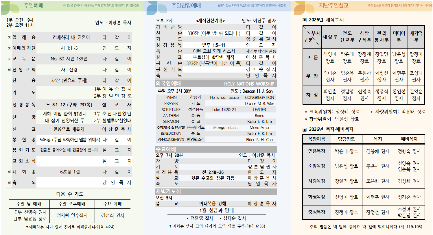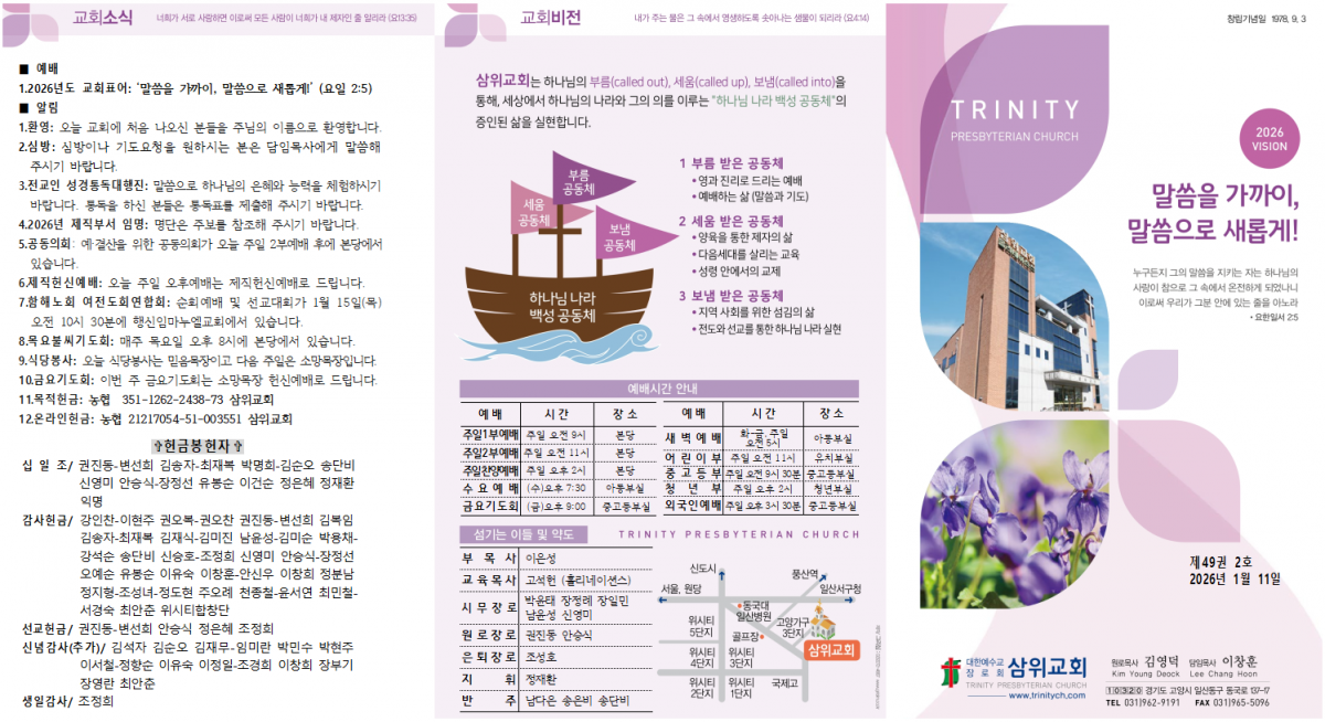 2026년 1월 11일 주보 삼위교회 댓글 0건 조회 26회 작성일 2026-01-10 10:51 가 본문내용 확대/축소 본문 2026년 1월 11일 주보2026년 1월 11일 주보 <이미지를 클릭하시면 크게 보실 수 있습니다.> 목록 댓글목록 다음글2026년 1월 4일 주보26.01.03