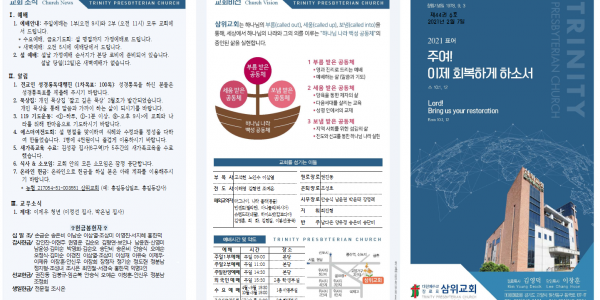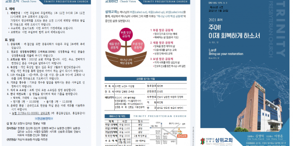 Ⅰ. 예배와 절기 ① 성탄절 : 12월 25일부터 1월 첫째 주일 전까지입니다. 성탄의 기쁨을 함께 나누시는 성도가 되시기 바랍니다. Ⅱ. 모임과 알림 ① 주일예배 : 오늘 주일 낮예배는 가정에서 영상예배로 드립니다. 각자의 처소에서 예배당 예배와 동일한 경건한 마음과 단정한 복장으로 주일예배에 임해주시길 바랍니다. ② 예산·결산 위원회 : 오늘 오전 11시 30분에 당회실에서 있습니다. …