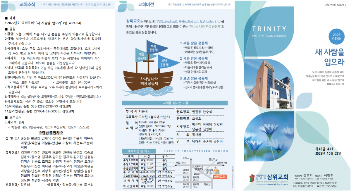 2025년 10월 26일 주보 삼위교회 댓글 0건 조회 523회 작성일 2025-10-25 11:31 가 본문내용 확대/축소 본문 2025년 10월 26일 주보2025년 10월 26일 주보 <이미지를 클릭하시면 크게 보실 수 있습니다.> 목록 댓글목록 이전글2025년 11월 2일 주보 25.11.01 다음글2025년 10월 19일 주보25.10.17
