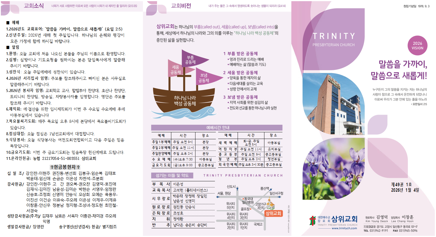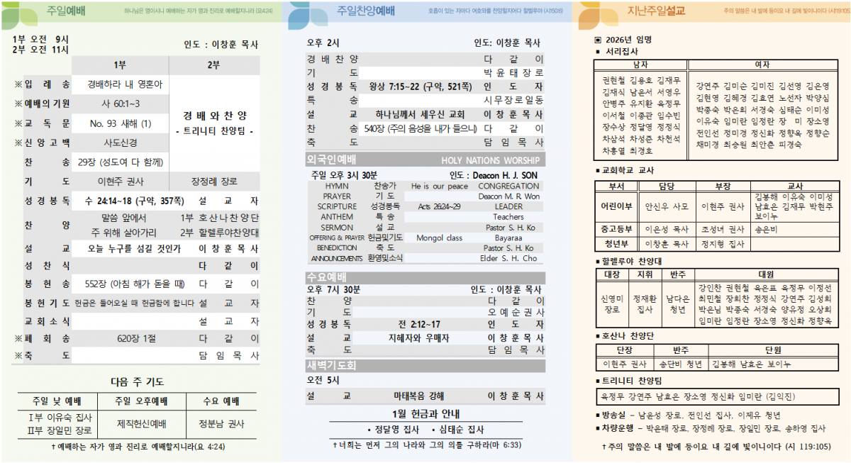 2026년 1월 4일 주보 삼위교회 댓글 0건 조회 409회 작성일 2026-01-03 11:27 가 본문내용 확대/축소 본문 2026년 1월 4일 주보2026년 1월 4일 주보 <이미지를 클릭하시면 크게 보실 수 있습니다.> 목록 댓글목록 이전글2026년 1월 11일 주보 26.01.10 다음글2025년 12월 28일 주보25.12.27