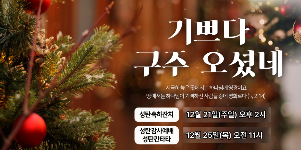 2025 성탄축하행사 * 교회학교 성탄축하잔치: 12월 21일(주일) 오후 2시 * 성탄감사예배 및 성탄칸타타: 12월 25일(목) 오전 11시