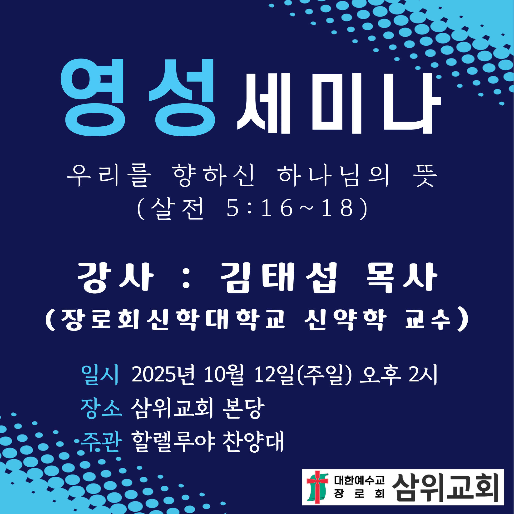 2025 영성 세미나 삼위교회 댓글 0건 조회 2,663회 작성일 2025-09-24 16:19 가 본문내용 확대/축소 본문 2025 영성 세미나 2025 영성 세미나 "우리를 향하신 하나님의 뜻" (살전 5:16~18) 강사 : 김태섭 목사 (장로회신학대학교 신약학 교수) 일시 : 2025년 10월 12일(주일) 오후 2시 장소 : 삼위교회 본당 주관 : 할렐루야 찬양대 목록 댓글목록 이전글이웃과 함께 하는 사랑 나눔 바자회 (11월) 25.10.11 다음글2025 바로크오라토리오 합창단 초청음악회25.09.24